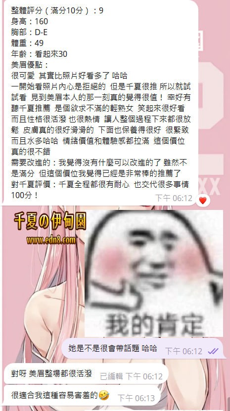 一開始看照片內心是拒絕的 但是千夏很推 所以就試試看 見到美眉本人的那一刻真的覺得很值! 幸好有聽千夏推薦 是個欲求不滿的輕熟女 笑起來很好看 而且性格很活潑 也很熱情 讓人整個過程下來都很放鬆 皮膚真的很好滑滑的 下面也保養得很好 很緊致 而且水多哈哈 情緒價值和體驗感都拉滿 這個價位真的很不錯